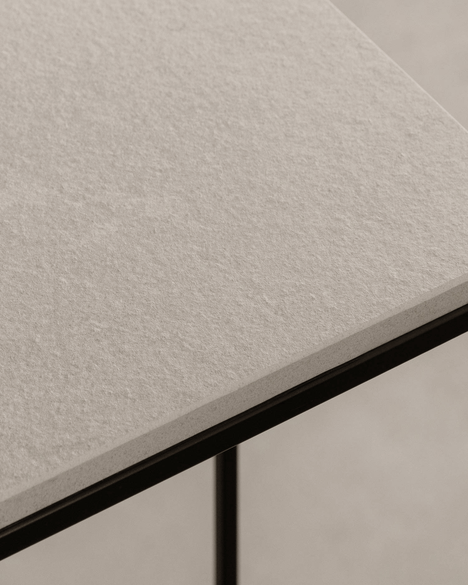 Acabado: Superficie: Porcelánico terminación mate. Estructura: La estructura tubular metálica va protegida con una resina epoxídica que se aplica conjuntamente con la pigmentación deseada en la propia masa aportando un acabado uniforme, durable y resistente a rayaduras y roces del día a día.